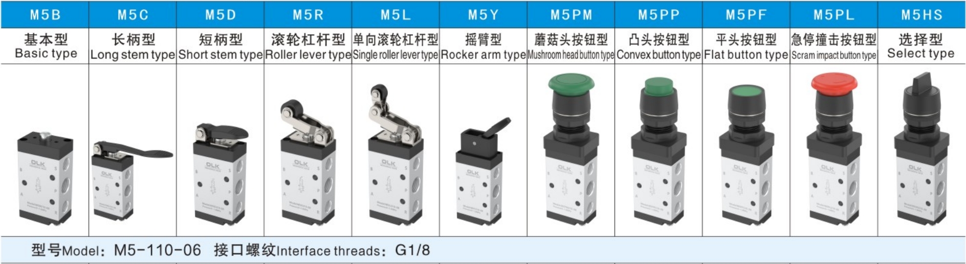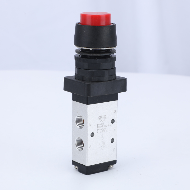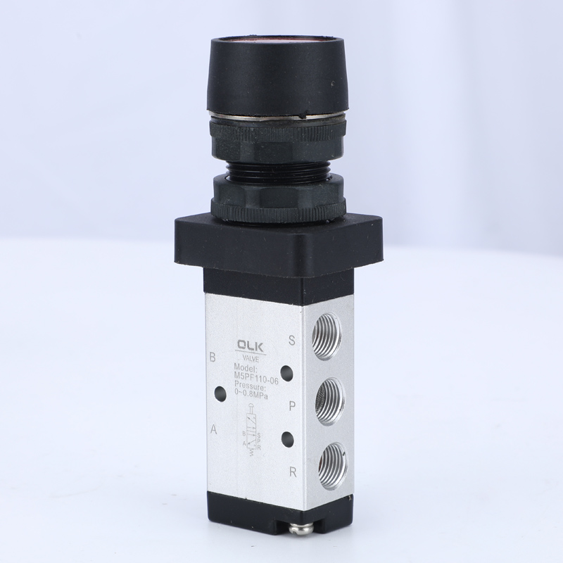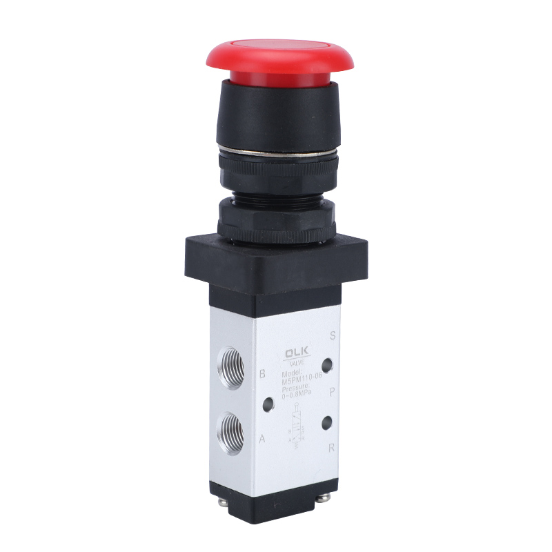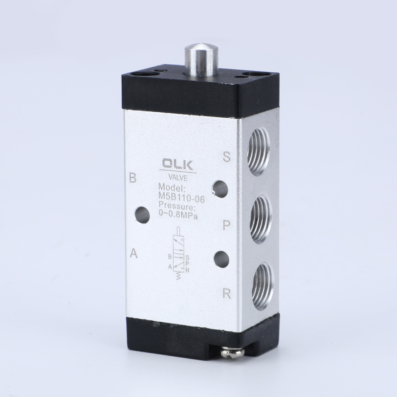 Válvula de botão mecânico de 5/2 vias da série AIRTAC TIPO M5 fabricada pela empresa pneumática OLK. A válvula mecânica M5 é uma estrutura de coluna deslizante.