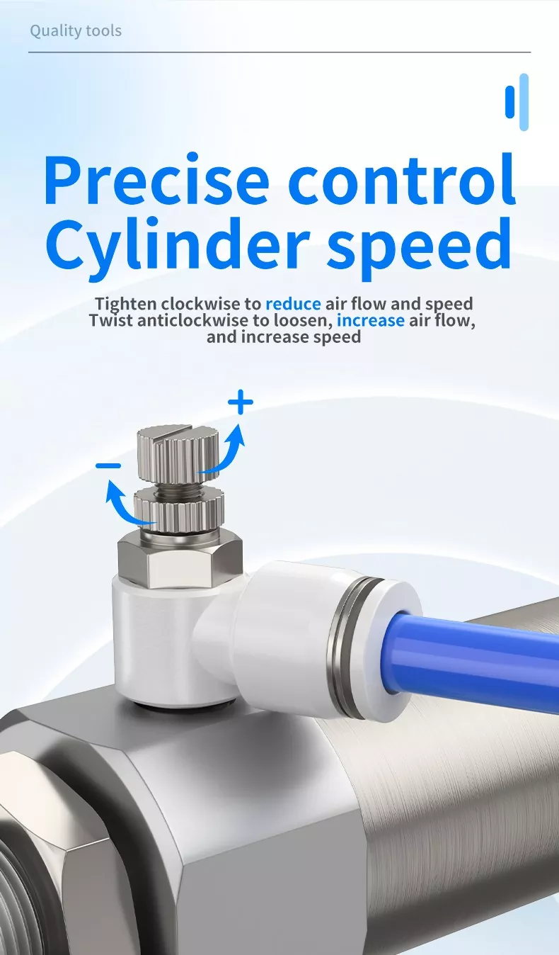 Os controladores de velocidade são componentes pneumáticos comuns usados para ajustar a velocidade de extensão e retração dos atuadores. As válvulas de aceleração são essencialmente componentes de ajuste de fluxo que controlam a velocidade do cilindro, mas suas posições de instalação, direções de aceleração e designs de corpo são diferentes. De acordo com o método de controle, eles podem ser divididos em tipo de estrangulamento de exaustão e tipo de estrangulamento de entrada.