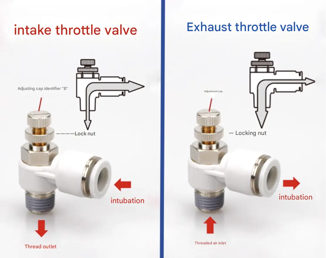 Estas são válvulas borboleta de admissão e escape, diferenciadas pelas marcações na tampa 'B' e 'OUT'. Eles podem ser usados em conjunto: a válvula borboleta de admissão ajusta o fluxo de fornecimento de ar, enquanto a válvula borboleta de escape controla a velocidade do cilindro para um controle mais preciso do sistema.