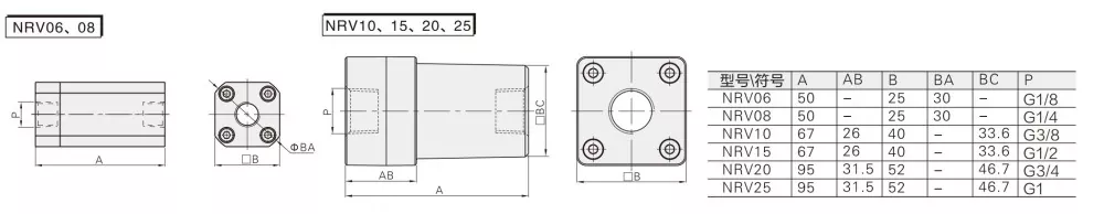 A válvula de retenção NRV possui um design compacto e robusto, geralmente feita de alumínio, latão ou aço inoxidável. Permite que o fluido ou o ar fluam apenas em uma direção, evitando o refluxo e protegendo o sistema.