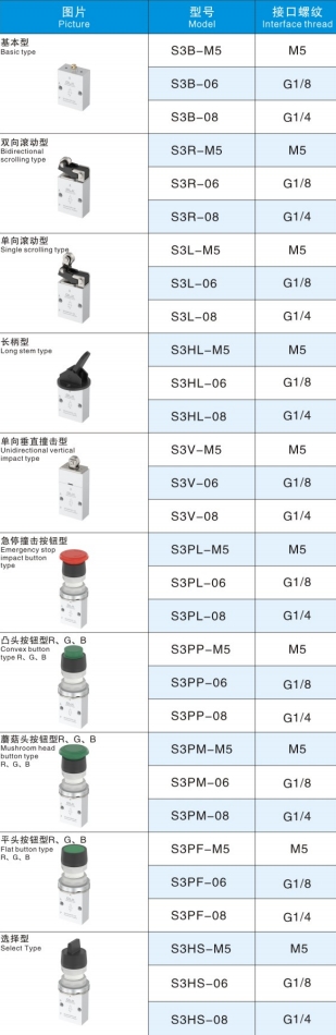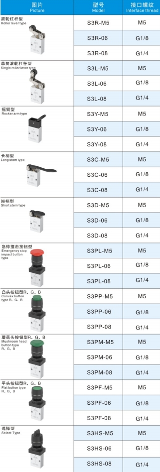 Você pode ter a certeza de comprar a válvula de controle de botão mecânico série S3 de 3 vias de nossa fábrica e ofereceremos o melhor serviço pós-venda e entrega pontual. Ouleikai (OLK) fabrica a válvula mecânica da série S3 de 3 vias e 2 posições de ação direta compacta e controlada externamente. Possui comutação flexível e pode ser instalado em várias posições. A instalação é muito conveniente e não requer lubrificação com óleo. As cabeças de controle estão disponíveis em materiais metálicos e plásticos, com o material metálico (S3C, S3D, S3Y, S3R, S3L) oferecendo vida útil mais longa e confiável. As combinações de cabeçotes de controle para a válvula mecânica podem ser encomendadas separadamente da fábrica OULEIKAI na China