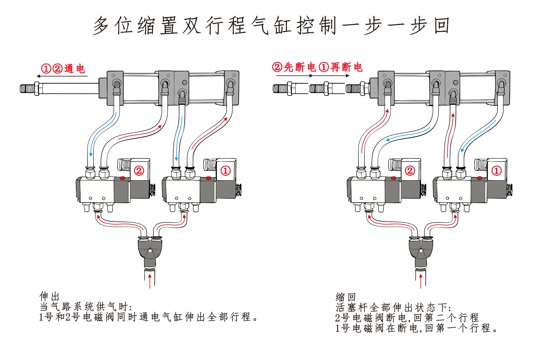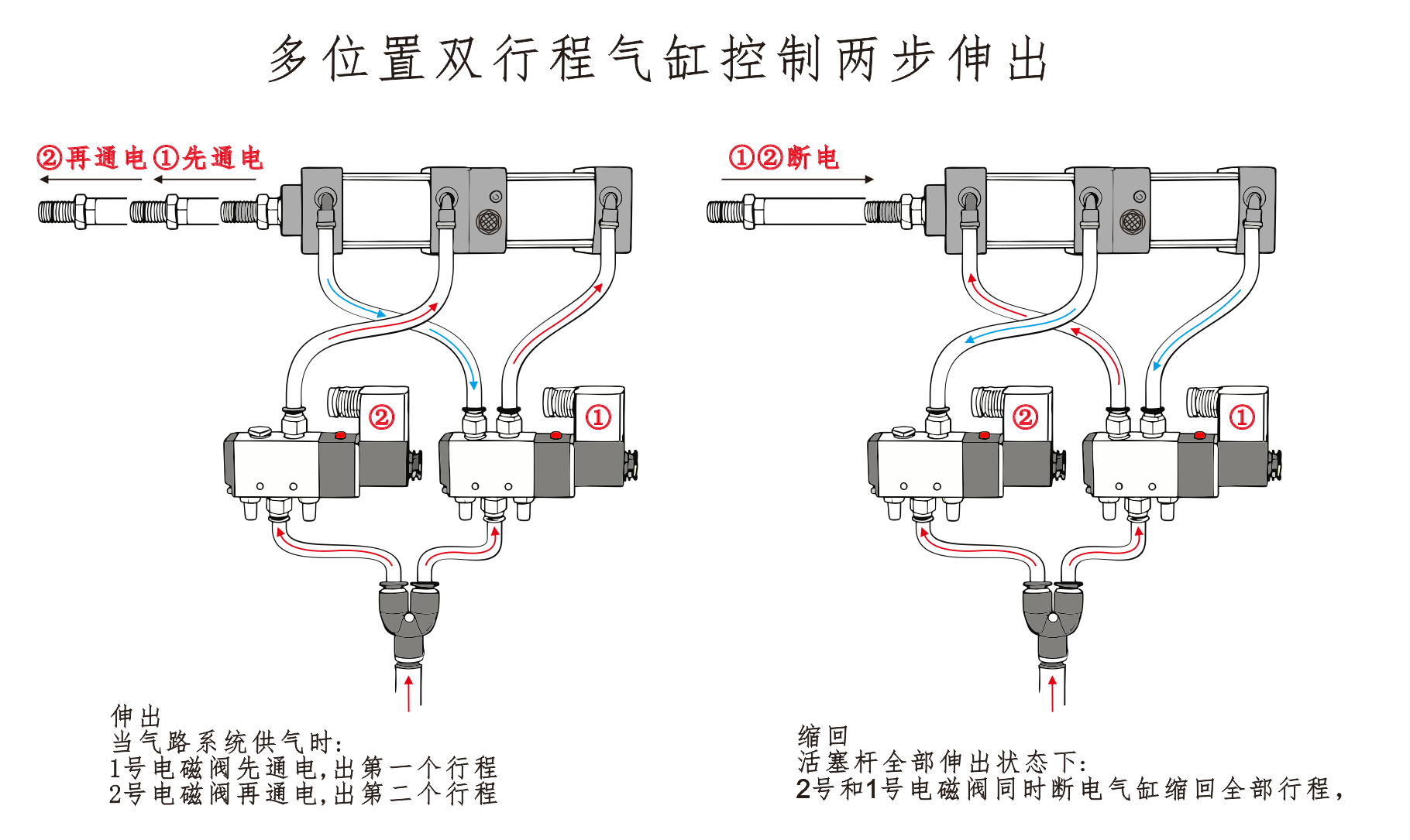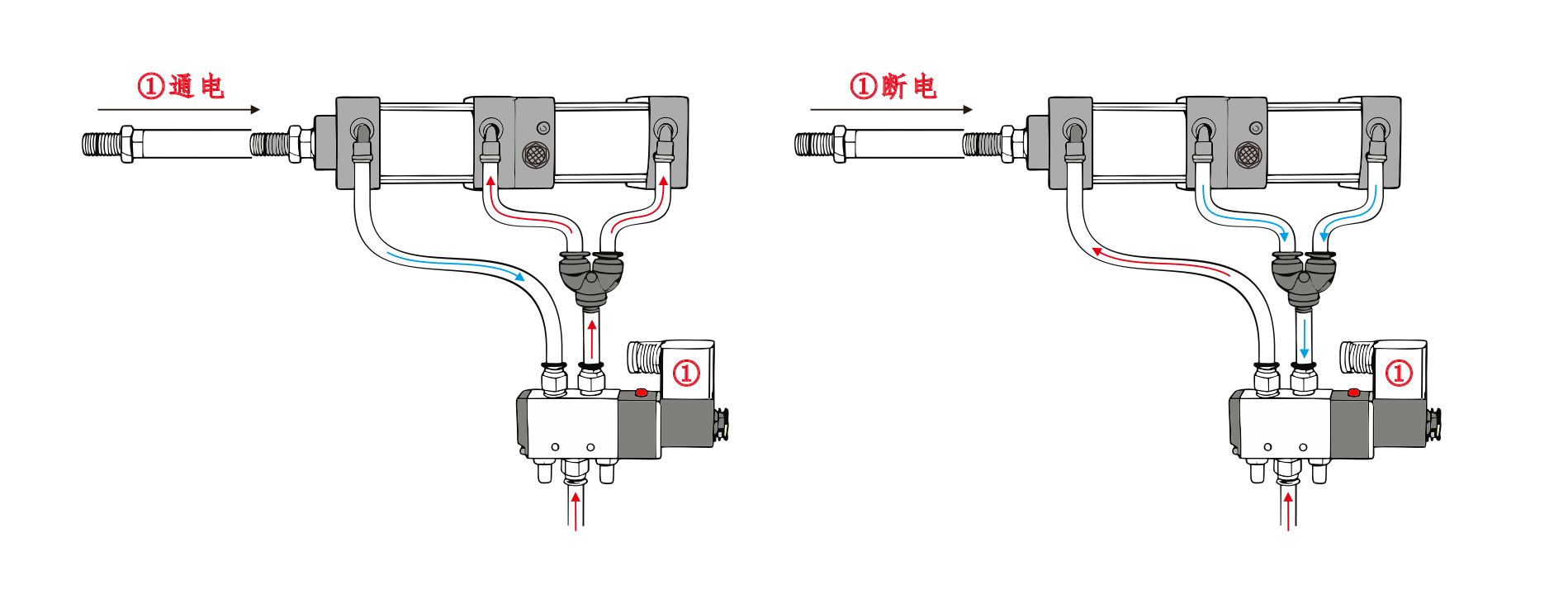 A entrada de ar do Cilindro①está conectada à Porta A da válvula solenóide, e a entrada de ar do Cilindro④está conectada em série à Porta B da válvula solenóide. A entrada de ar do Cilindro③está conectada a um silenciador. Quando a porta A da válvula solenóide é energizada, os cilindros permanecem na posição retraída. Quando a Porta B é energizada, os cilindros começam a operar.