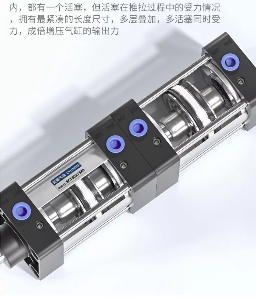 O cilindro do tirante SCT possui anéis de vedação YCC bidirecionais e um poderoso design de curso duplo, com uma aparência compacta e refinada que garante ação rápida e saída suave e estável. Cada camada do cilindro contém um pistão individual e, durante o processo push-pull, vários pistões compartilham a carga, permitindo que o cilindro atinja o comprimento mais compacto enquanto gera força de saída multiplicada através de sua estrutura empilhada de múltiplas camadas. Este design de força dupla proporciona maior potência e a configuração de seis anéis de vedação proporciona excelente desempenho de vedação, permitindo que o cilindro mantenha pressão de até 1,4 MPa sem vazamento.
