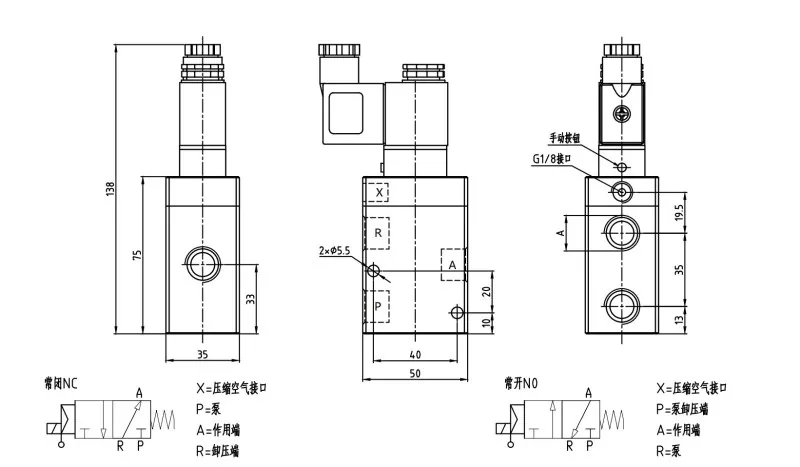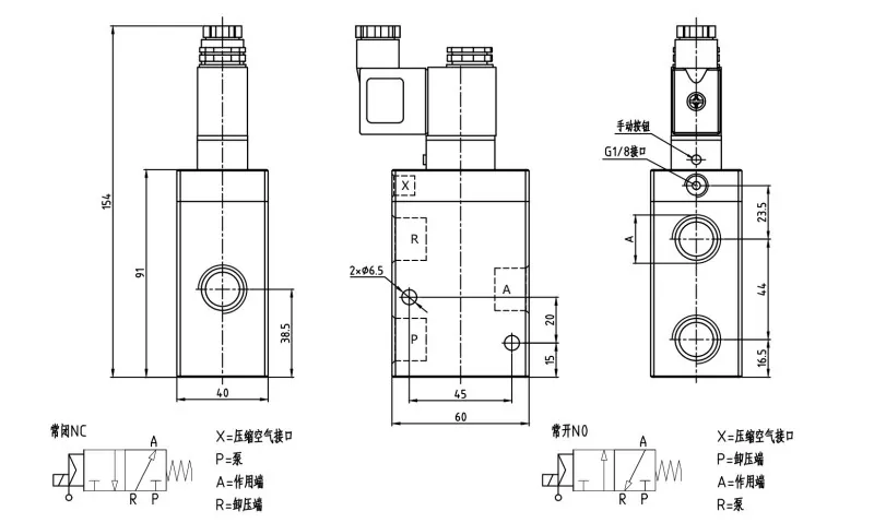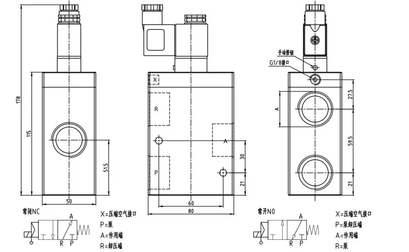 Os tamanhos da porta rosqueada (P,A,R) estão disponíveis em G3/8, G1/2 e G1, com a porta de ar comprimido (X) em G1/8.